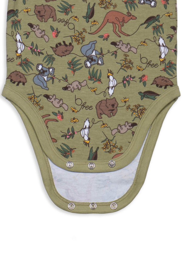The 100% Organic Cotton Short Sleeve Baby Bodysuit features an original B Free print that pays homage to Australiana flora and fauna. With a playful hand-drawn feel, the khaki colour will be super cute on your little one and is also perfect as a thoughtful gift to family and friends.