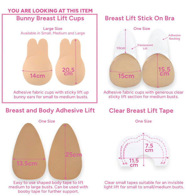 *Sizing note: The cup sizes in this product are to be used as a guide but individual body shape, size and preference should also be taken into consideration. For larger sizes, or for greater lift, please see our Breast Lift Adhesive Bra. If you require greater vertical lift or have a heavier chest you may prefer to go up a size, or you can add booby tape for more security. If you have had a surgical breast lift, you may find this product suitable even if you are significantly larger than the recommended sizing.