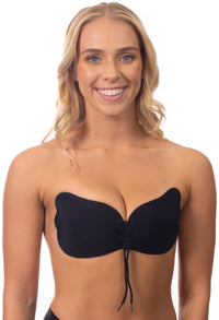 The cups are designed like angel wings to give a smoother transition from your skin to the bra; while the lace-up front allows you to customize how much cleavage you want to create and boosts even the smallest of cup sizes.